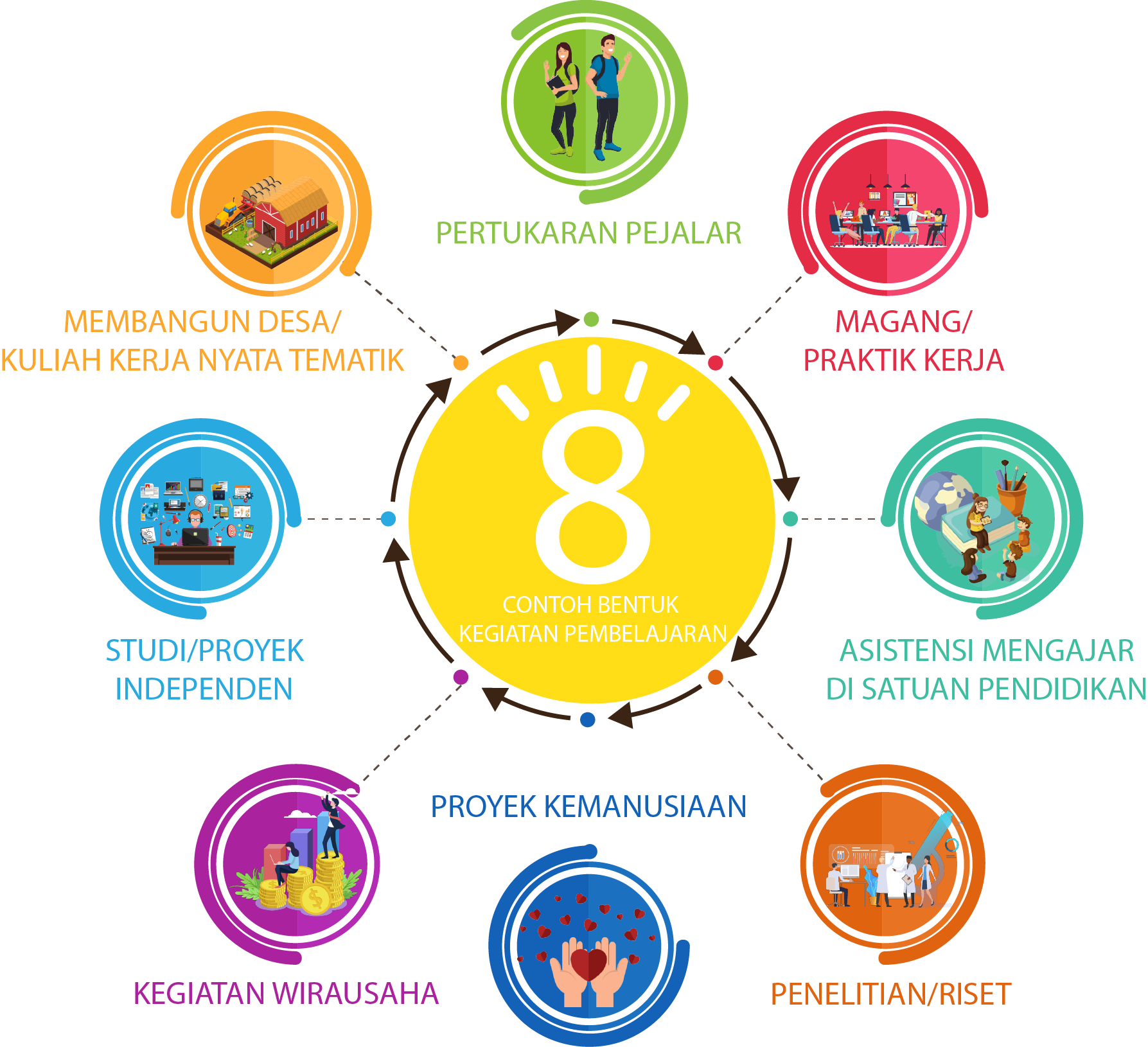 7. Banyak mahasiswa yang memiliki passion untuk mewujudkan karya besar yang dilombakan di tingkat internasional atau karya dari ide yang inovatif. Idealnya, studi/ proyek independen dijalankan untuk menjadi pelengkap dari kurikulum yang sudah diambil oleh mahasiswa. Perguruan tinggi atau fakultas juga dapat menjadikan studi independen untuk melangkapi topik yang tidak termasuk dalam jadwal perkuliahan, tetapi masih tersedia dalam silabus program studi atau fakultas. Kegiatan proyek independent dapat dilakukan dalam bentuk kerja kelompok lintas disiplin keilmuan.