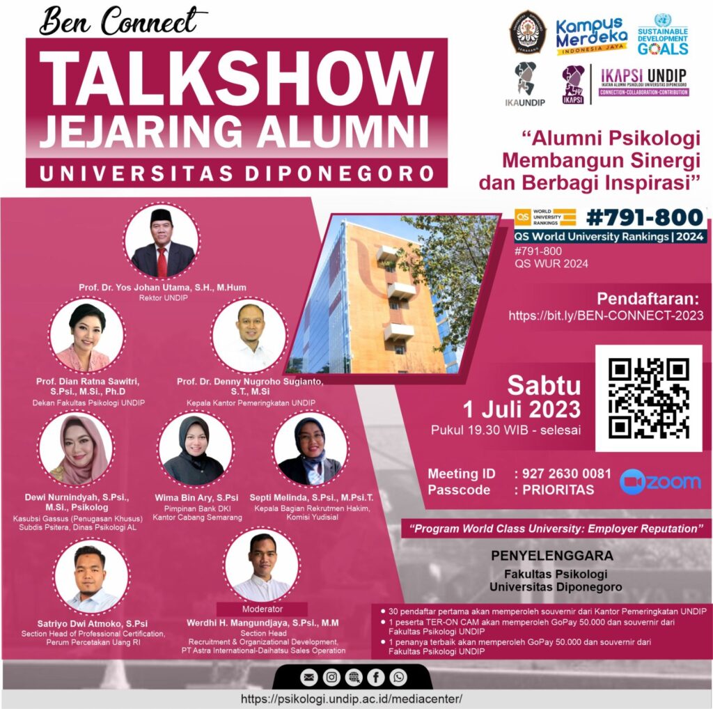 Alumni Fakultas Psikologi Undip membangun sinergi dan berbagi inspirasi dalam acara Ben Connect: Talkshow Jejaring Alumni 2023. Acara akan diselenggarakan pada Sabtu, 1 Juli 2023 mulai pukul 19.30.