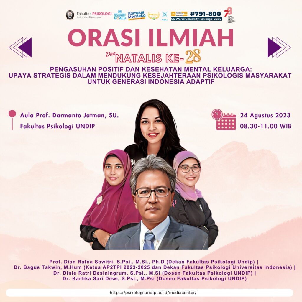 Tak terasa 28 tahun sudah Fakultas Psikologi Universitas Diponegoro berkontribusi terhadap kemajuan ilmu psikologi di Indonesia. Sesuai dengan visi menjadi pusat pengembangan psikologi berbasis keluarga Indonesia yang adaptif terhadap perubahan zaman di Asia Tenggara pada tahun 2025, Fakultas Psikologi Universitas Diponegoro mengusung tema pengasuhan positif dan kesehatan mental keluarga pada perayaan Dies Natalis ke-28.
