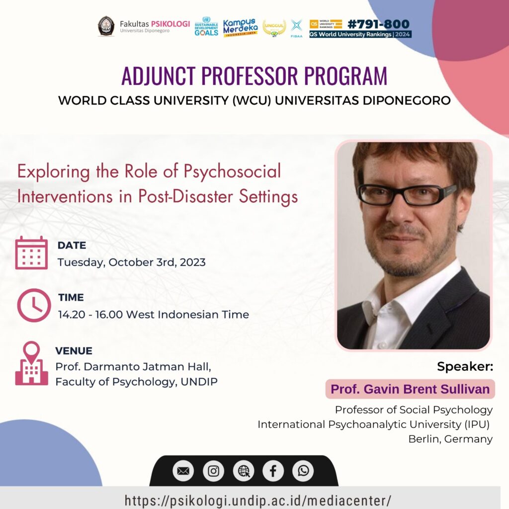 Bergabunglah bersama kami pada hari Selasa, 3 Oktober 2023, mulai jam 14.20 hingga jam 16.00 WIB di Aula Prof. Darmanto Jatman, Fakultas Psikologi UNDIP. Mari kita simak Adjunct Professor UNDIP, Prof. Dr. Gavin Brent Sullivan dari IPU Berlin, Jerman, dalam kuliah khusus untuk mahasiswa Magister mata kuliah Intervensi Psikososial.