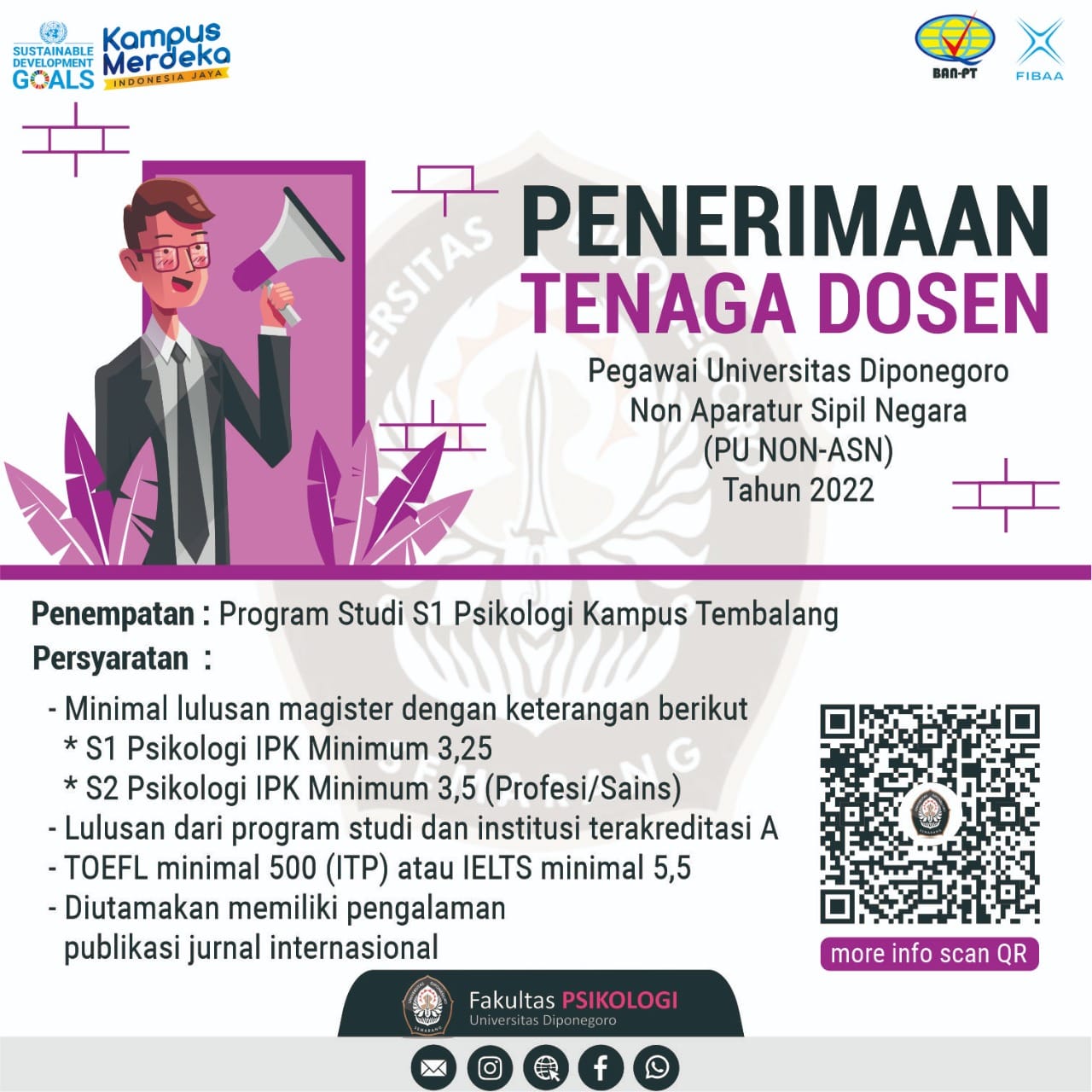 Intending to the fulfillment of lecturer in the University of Diponegoro provides an opportunity for the Indonesian citizen to join the Selection of Candidates for Permanent Employees at Diponegoro University for Non-State Civil Apparatus (PU Non-ASN). The requirements, the stages of registration, and others can be found in the QR code above or click the link below: