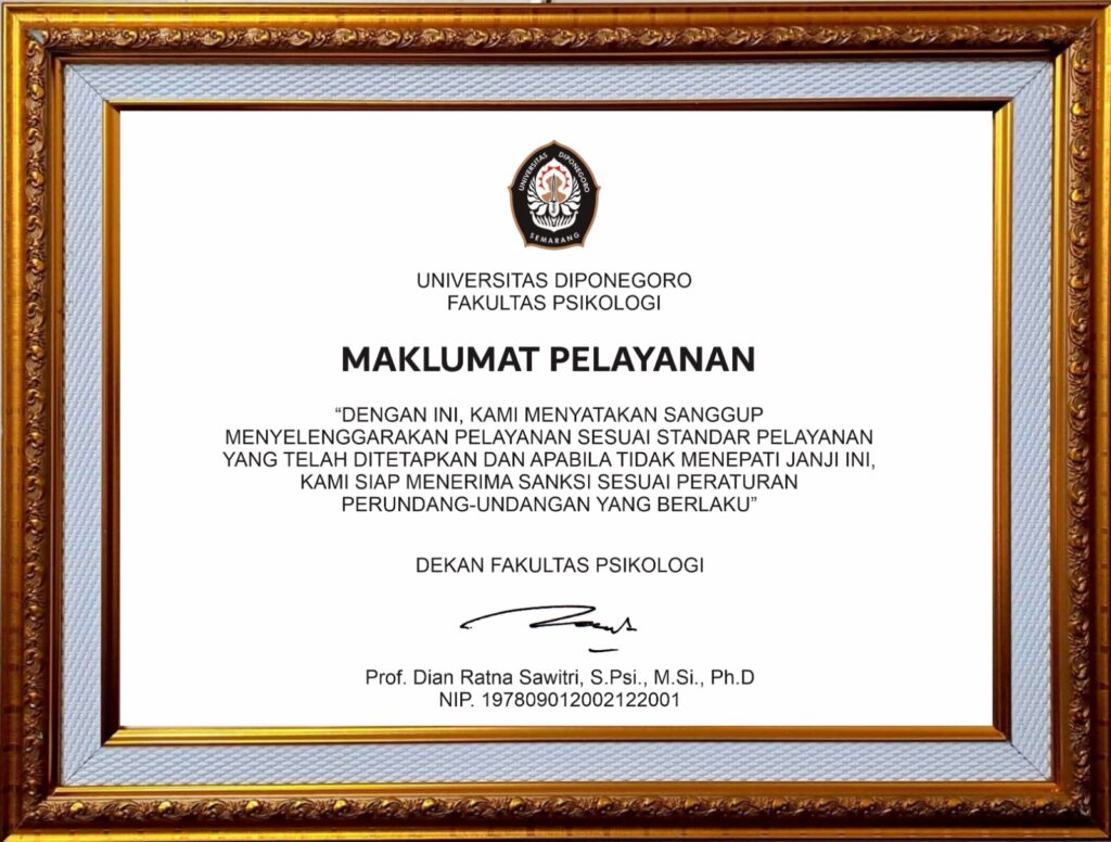 Dalam rangka mewujudkan Zona Integritas Wilayah Bebas Korupsi (ZI-WBK) Fakultas Psikologi Universitas Diponegoro mendeklarasikan “Maklumat Pelayanan”. Dengan adanya deklarasi ini diharapkan menjadi cambuk bagi civitas akademika UNDIP terutama Fakultas Psikologi Undip untuk terus meningkatkan pelayanannya.