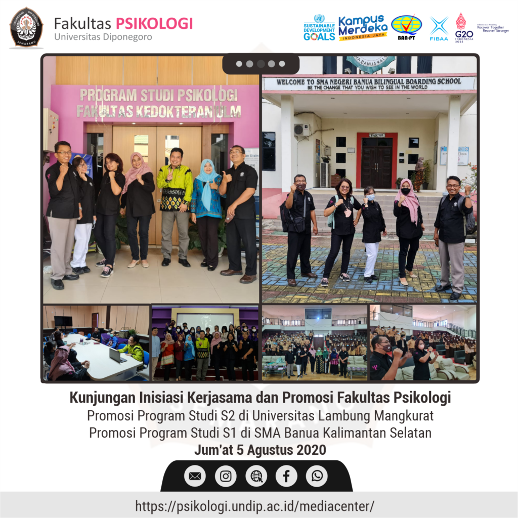 The Faculty of Psychology, Diponegoro University initiate collaboration visits and faculty promotions. Promotional activities for the postgraduate study program were carried out at Lambung Mangkurat University while the promotion for the undergraduate study program was carried out at the Banua High School, South Kalimantan. August 5, 2022.