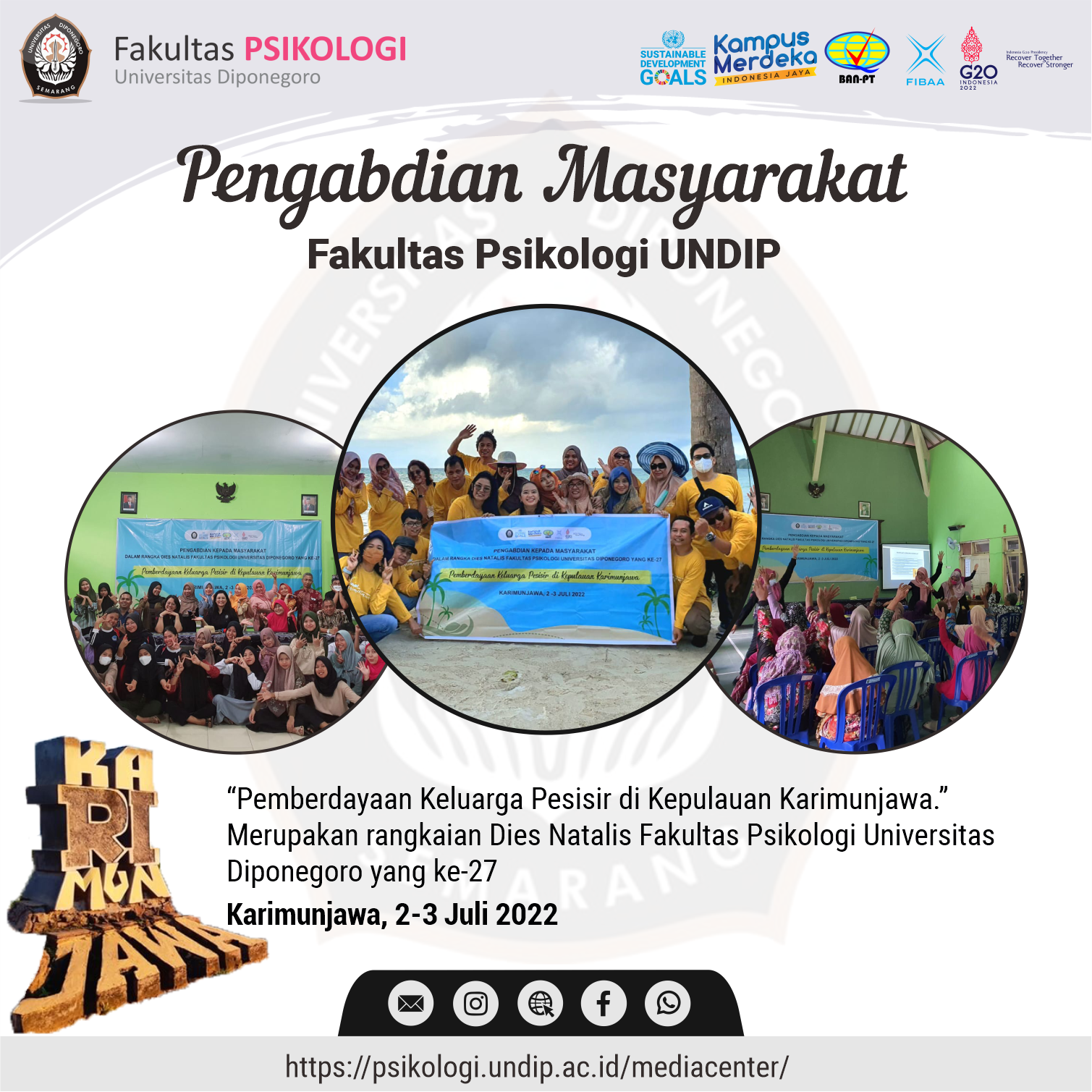 Fakultas Psikologi Universitas Diponegoro menyelenggarakan kegiatan Pengabdian kepada Masyarakat di Karimunjawa, Kabupaten Jepara, Jawa Tengah. Kegiatan tersebut merupakan rangkaian Dies Natalis Fakultas Psikologi UNDIP yang ke-27. Kegiatan berlangsung pada tanggal 2-3 Juli 2022 dengan mengambil tema “Pemberdayaan Keluarga Pesisir di Kepulauan Karimunjawa.”