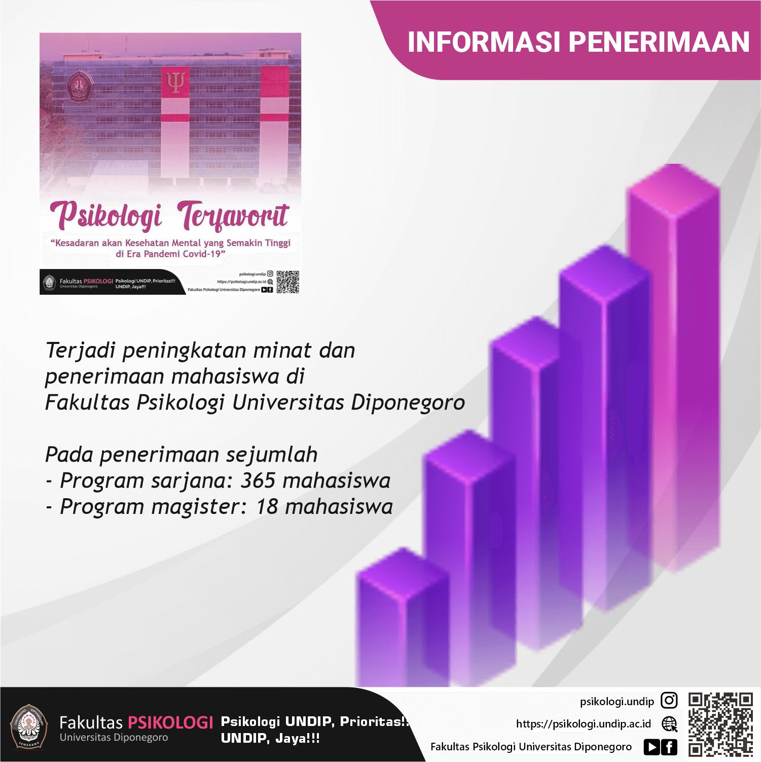 Sebagai informasi bahwa Fakultas Psikologi Undip tahun ini telah menerima sejumlah 365 mahasiswa program sarjana dan 18 mahasiswa program magister. Peminat pendaftar di Fakultas Psikologi semakin meningkat terutama di era pandemi COVID-19 saat ini. Hal ini dapat diasumsikan bahwa tingkat kesadaran akan kesehatan mental telah semakin meningkat ditengah masyarakat (Merujuk pada psikologi.undip).