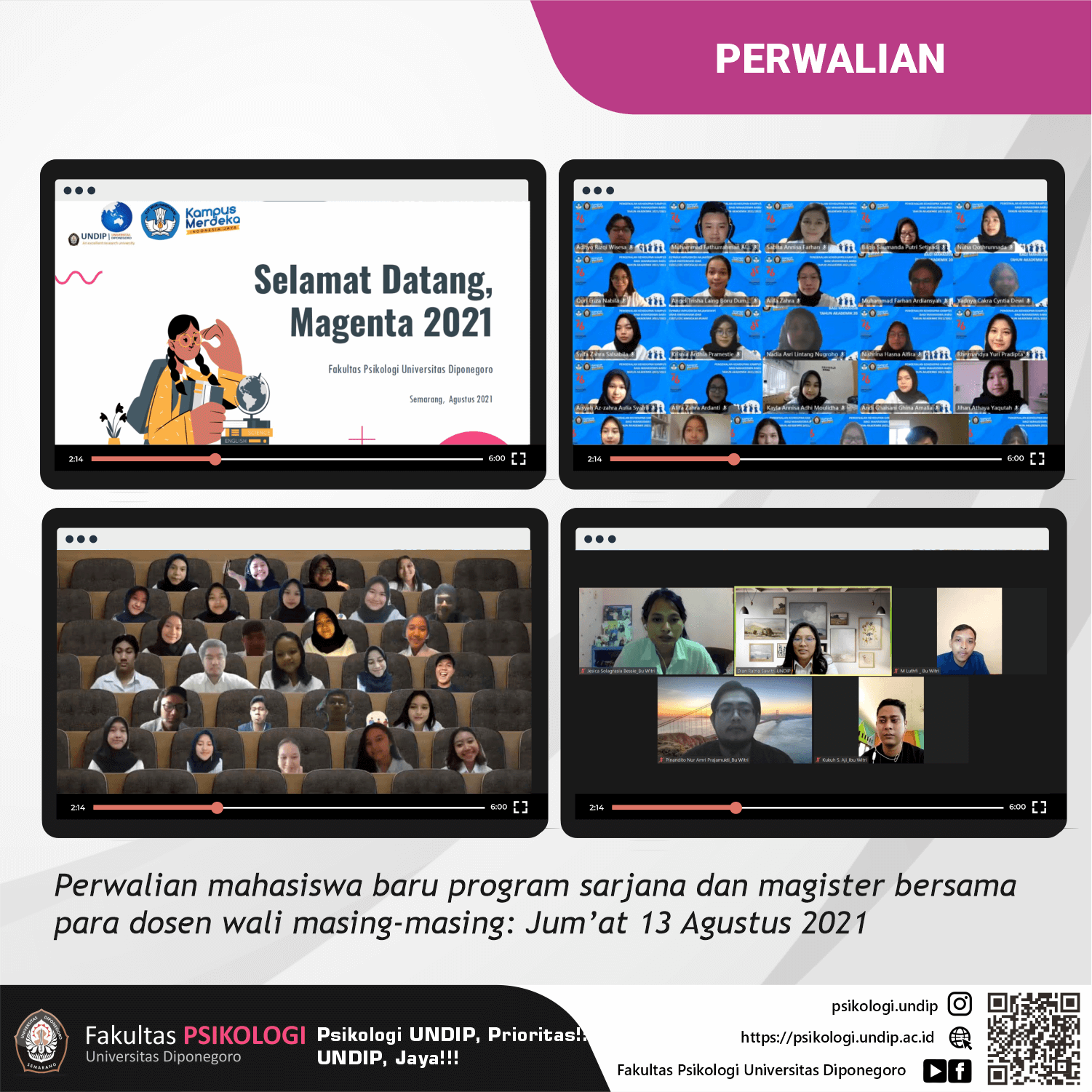 Setelah kegiatan perwalian rangkaian PMB di Fakultas Psikologi UNDIP masih belum mencapai puncaknya. Kegiatan dilanjutkan pada hari berikutnya yaitu Sabtu 14 Agustus 2021 dengan menghadirkan para orang tua/wali/keluarga mahasiswa baru. Para pengelola Fakultas Psikologi UNDIP diwakili oleh ibu Dekan Prof. Dian Ratna Sawitri, S.Psi., M.Si., Ph.D., wakil dekan 1 bidang akademik dan kemahasiswaan ibu Dr phil Dian Veronika Sakti Kaloeti, S.Psi., M.Psi. dan wakil dekan 2 bidang sumber daya ibu Dr. Novi Qonitatin, S.Psi., M.A.