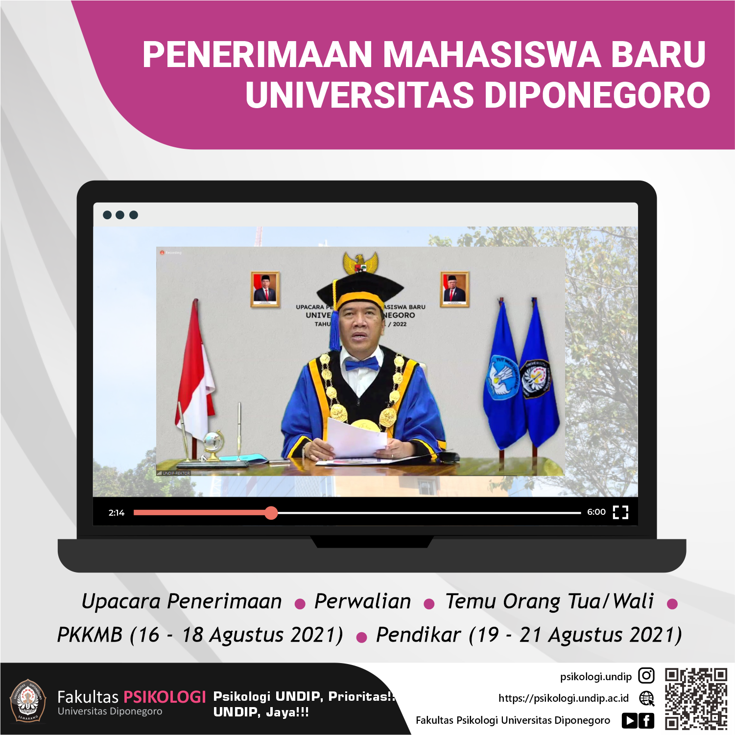 Rangkaian PMB Fakultas Psikologi Universitas Diponegoro masih belum berakhir. Masih akan dilaksanakan kegiatan Pengenalan Kehidupan Kampus Mahasiswa Baru (PKKMB) pada 16-18 Agustus 2021 dan Pendidikan Karakter (PENDIKAR) pada 19-21 Agustus 2021. Simak informasi terbaru Fakultas Psikologi Universitas Diponegoro melalui berbagai saluran media sosial dan web resmi kami.