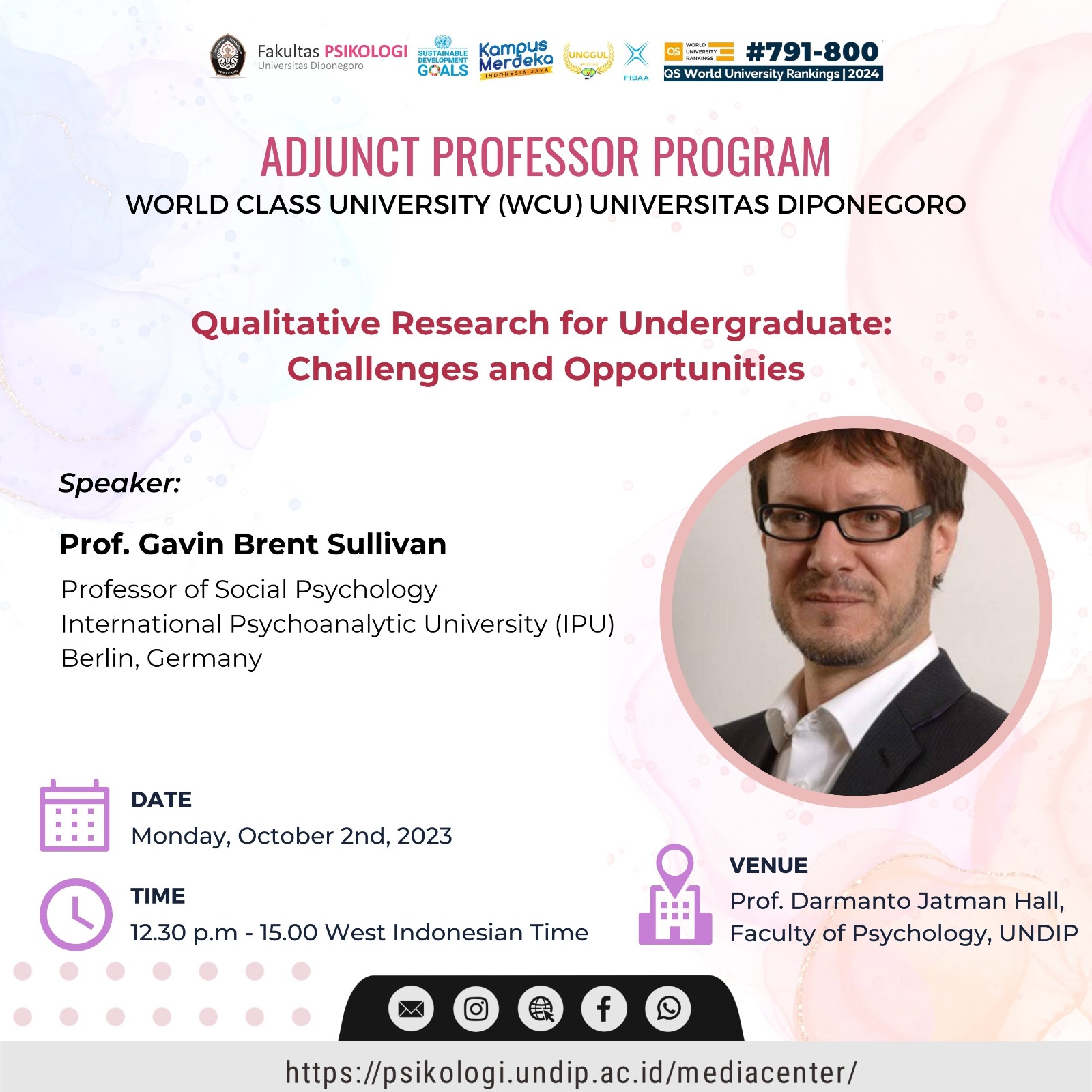 Hai teman-teman mahasiswa! Bergabunglah pada hari Senin, 02 Oktober 2023, mulai jam 12.30 siang hingga jam 15.00 WIB di Aula Prof. Darmanto Jatman, Fakultas Psikologi UNDIP. Kita akan menyambut Adjunct Professor UNDIP yang akan memberikan rangkaian kuliah dosen tamu: Prof. Dr. Gavin Brent Sullivan dari IPU Berlin, Jerman.