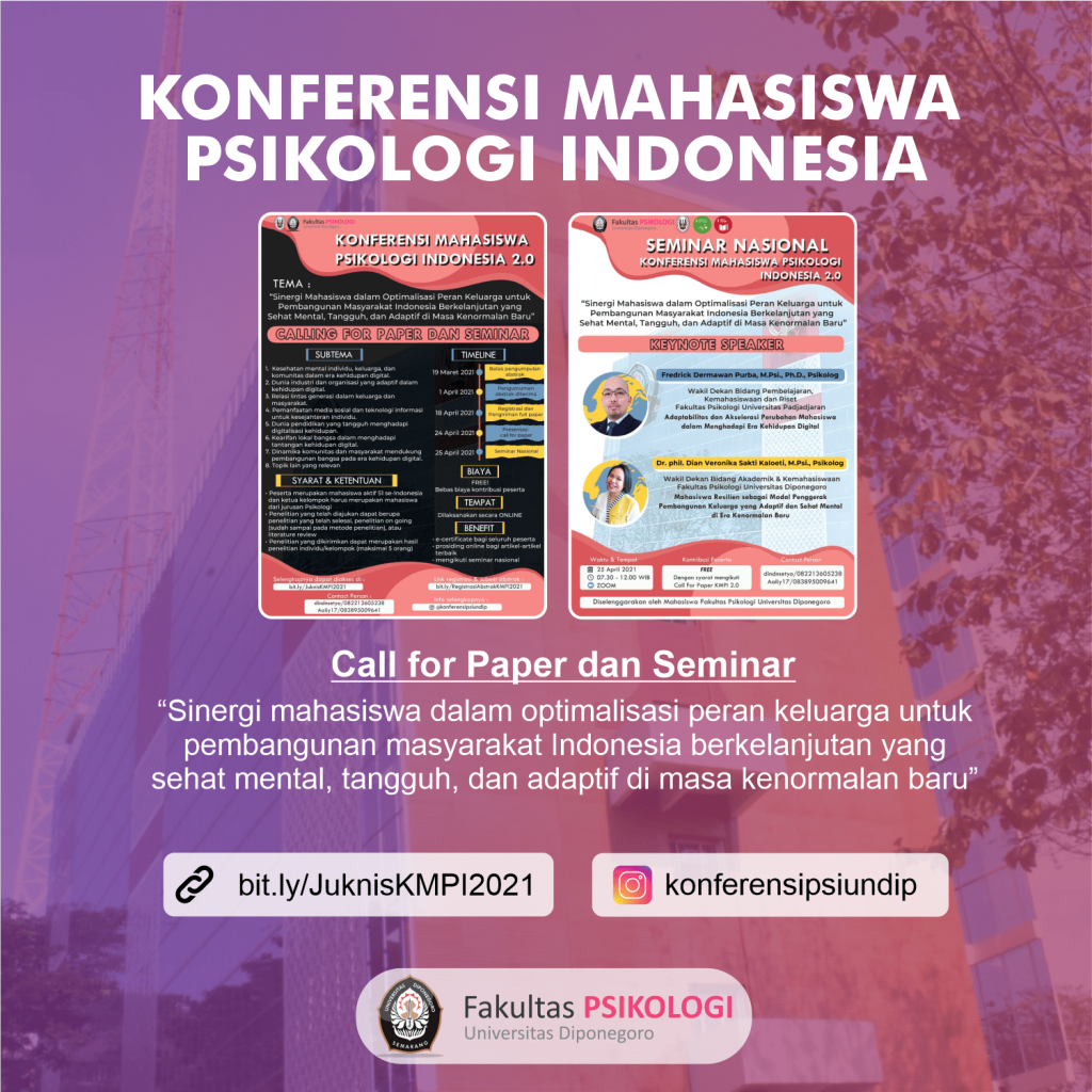The Indonesian Psychology Student Conference 2.0 will be online from 24 to 25 April 2021. This conference will involve all psychology students throughout Indonesia. The theme for this conference is “Student Synergy in Optimizing the Role of the Family for the Development of a Sustainable Indonesian Society that is Mentally Healthy, Resilient, and Adaptive in the New Normalization Period.”