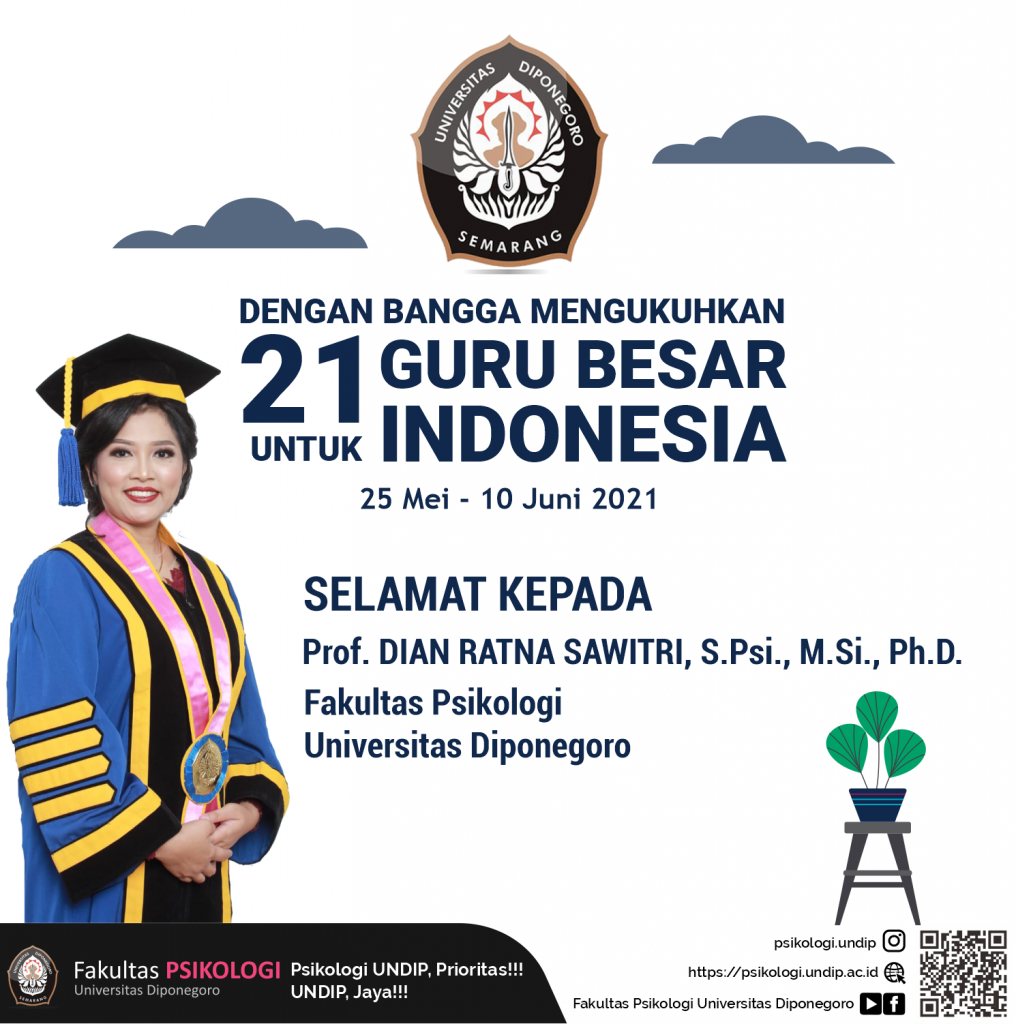 On Tuesday, 8 June 2021, the Diponegoro University Professor Inauguration was held in a hybrid way on the Diponegoro University Official Youtube. One of the professors who was inaugurated came from the Faculty of Psychology, namely Prof. Dian Ratna Sawitri, S.Psi., M.Sc., Ph.D. as dean of the Faculty of Psychology, Diponegoro University.