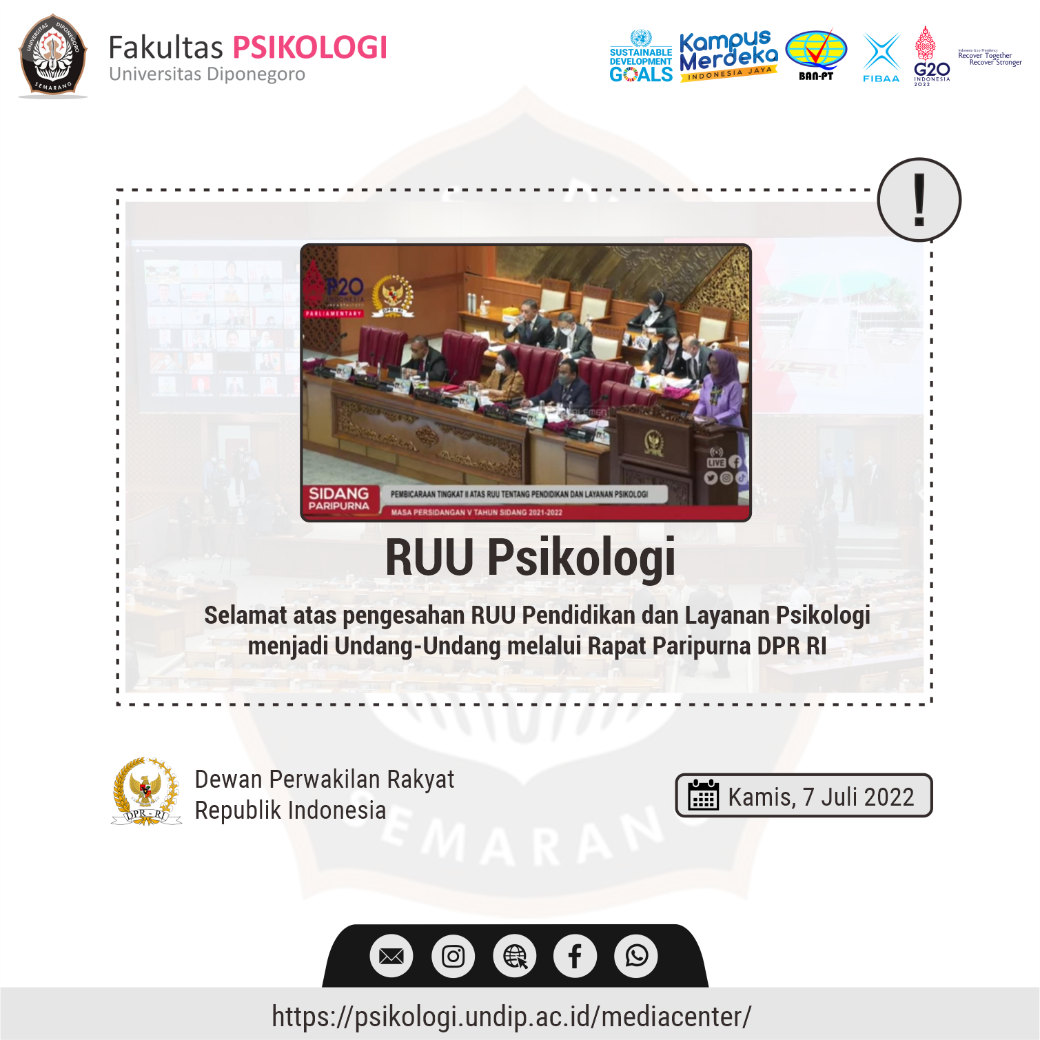 The Faculty of Psychology, Diponegoro University, congratulated for passing the bill on education and Psychological Services into law through the DPR RI Plenary Meeting on Thursday, July 7, 2022. In the meeting, Hetifah Sjaifudin (Vice Chairman of Commission X DPR RI) conveyed six main topics or substance of the bill, among others, which are: